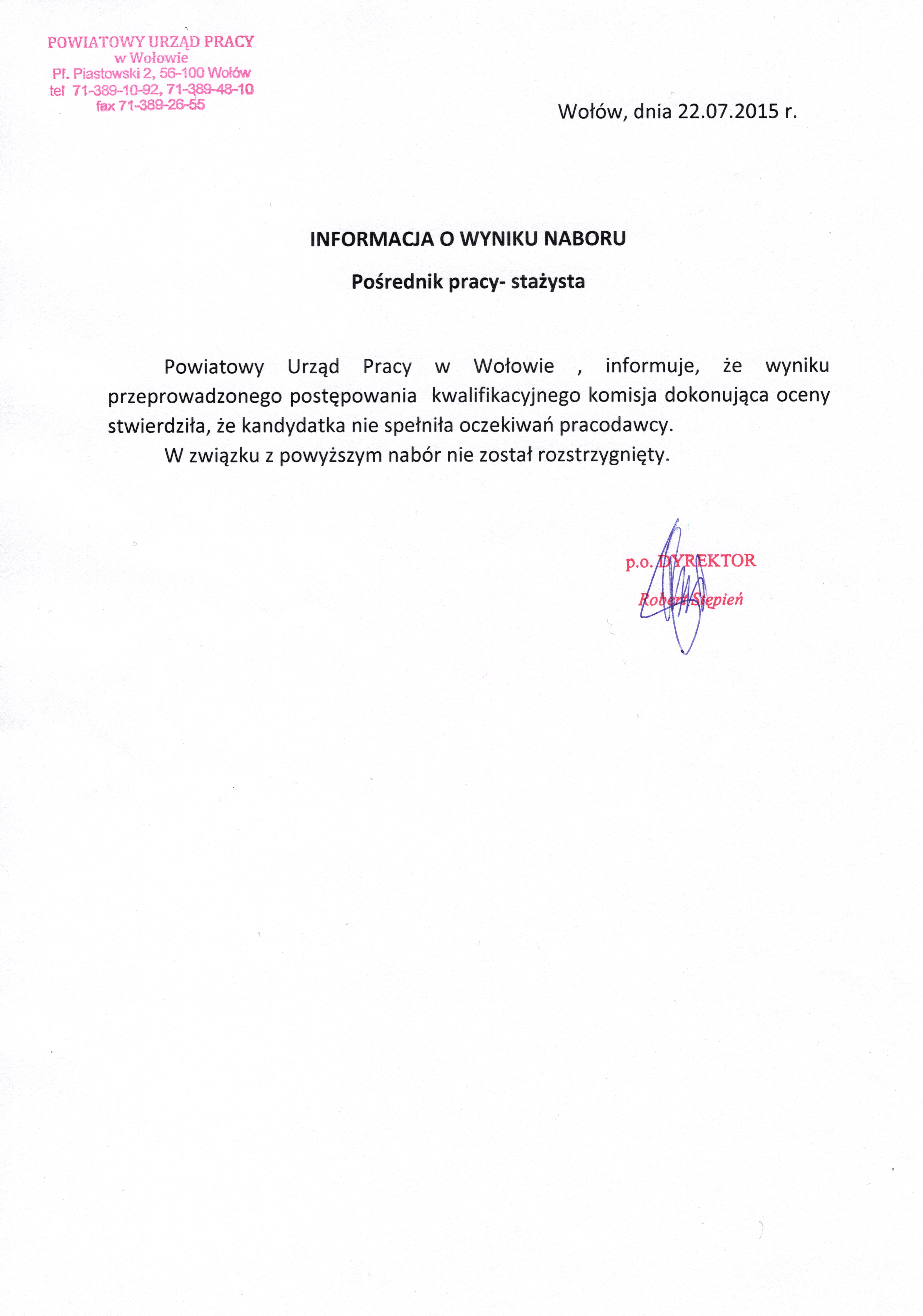 | Nazwa dokumentu: | Wyniki naboru na wolne stanowisko urzędnicze pośrednik pracy-stażysta w Centrum Aktywizacji Zawodowej PUP w Wołowie |